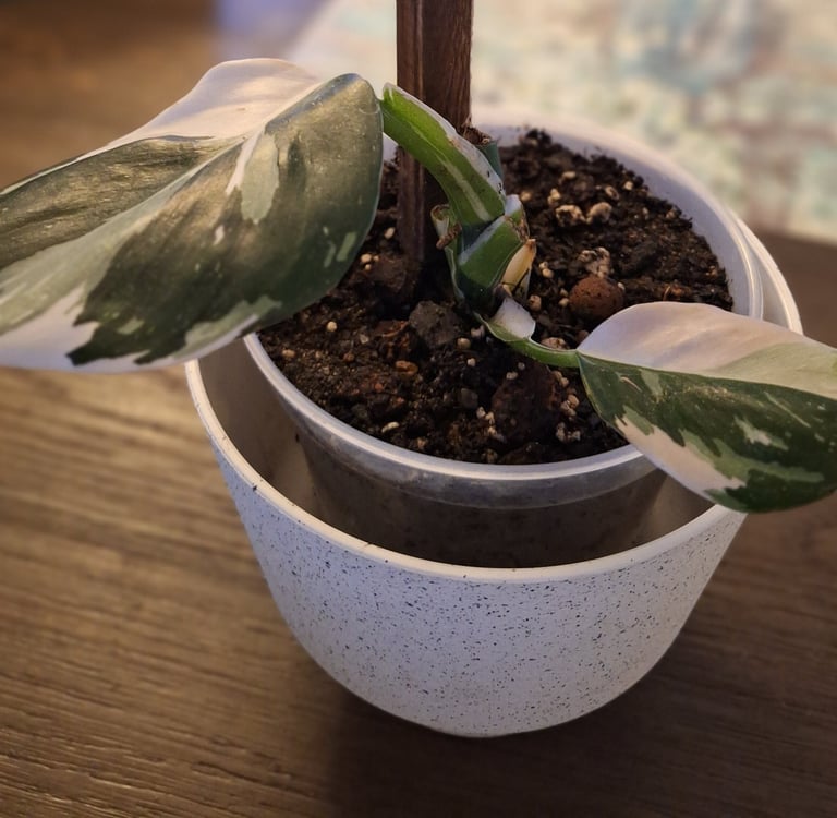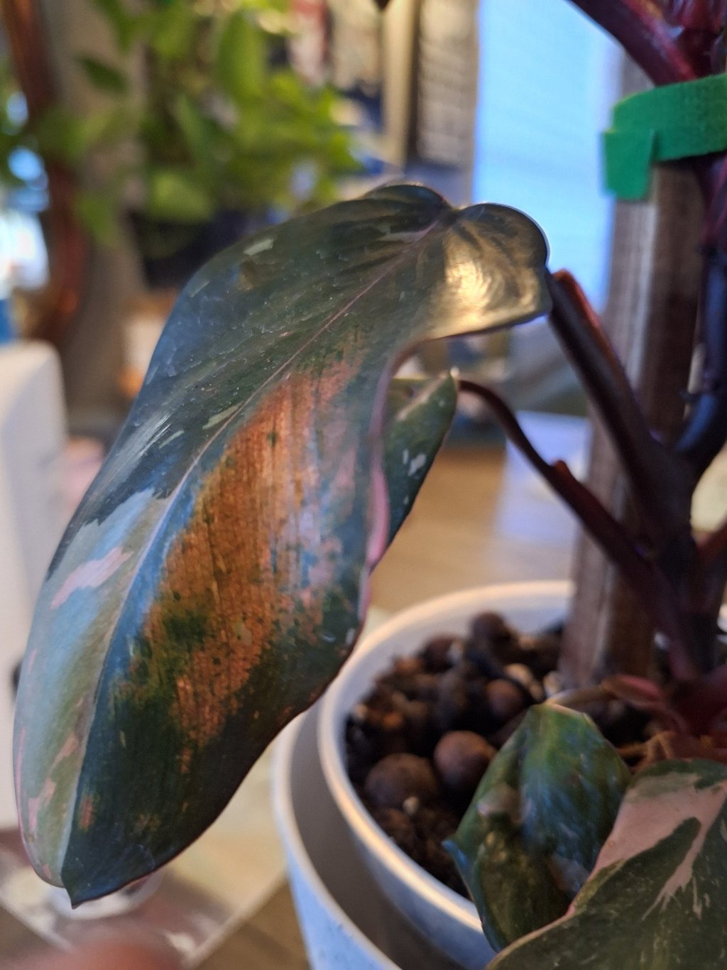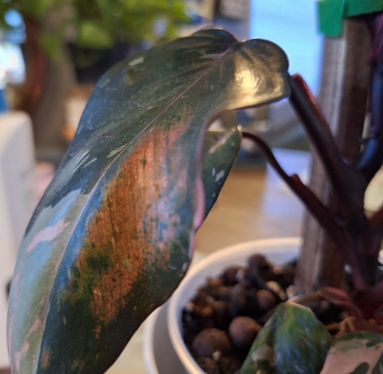 Now my day was full, I began inspecting everyone one by one, my Monstera, beautiful as always, my Birkin, great, my Polly, always a stunner. OK, I started to relax a little and then I saw my White Wizard!! Same exact thing!! awful copperish looking roughish weird looking patches.